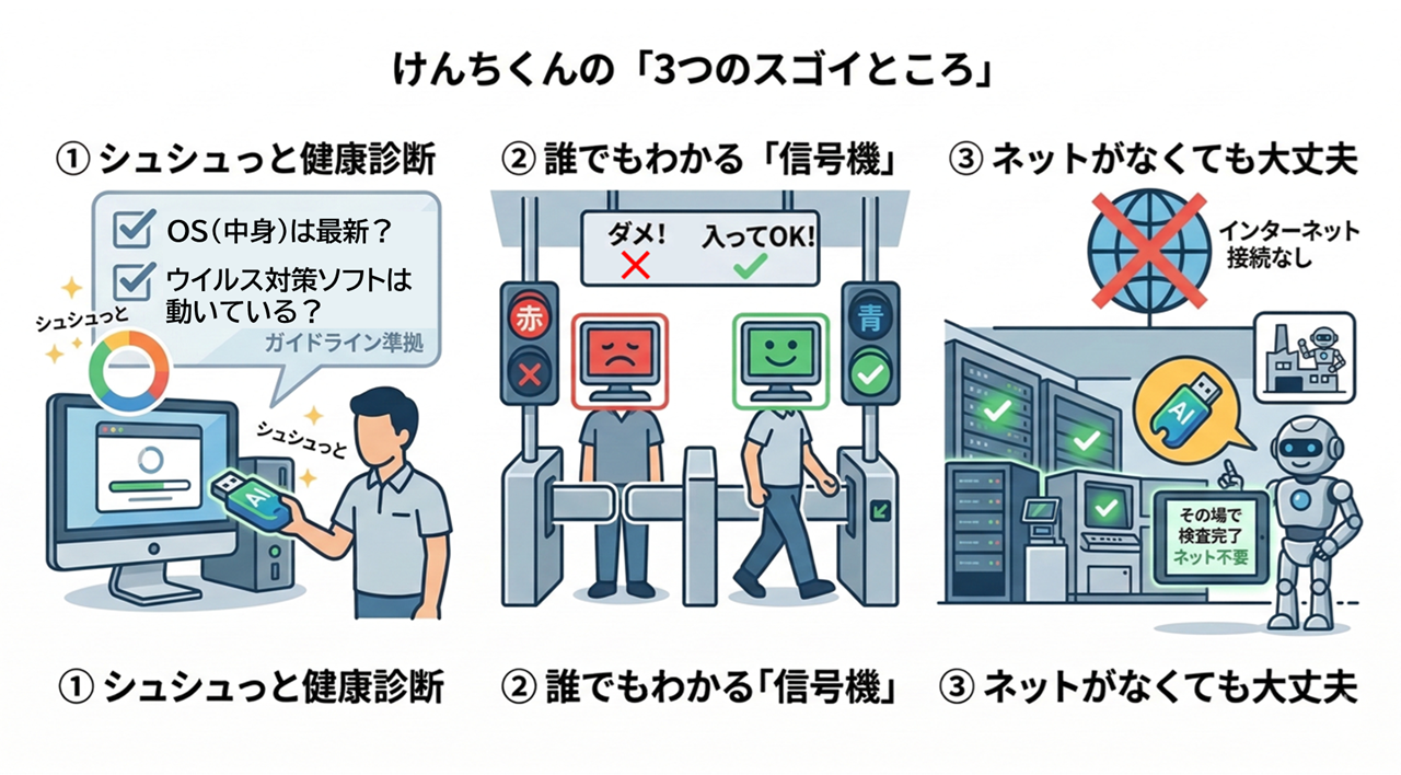 ③ネットがなくても大丈夫: セキュリティが厳しい工場の中は、インターネットに繋がっていないこともあります。でも、けんちくんならネット環境がなくてもその場でしっかり検査ができるのです。