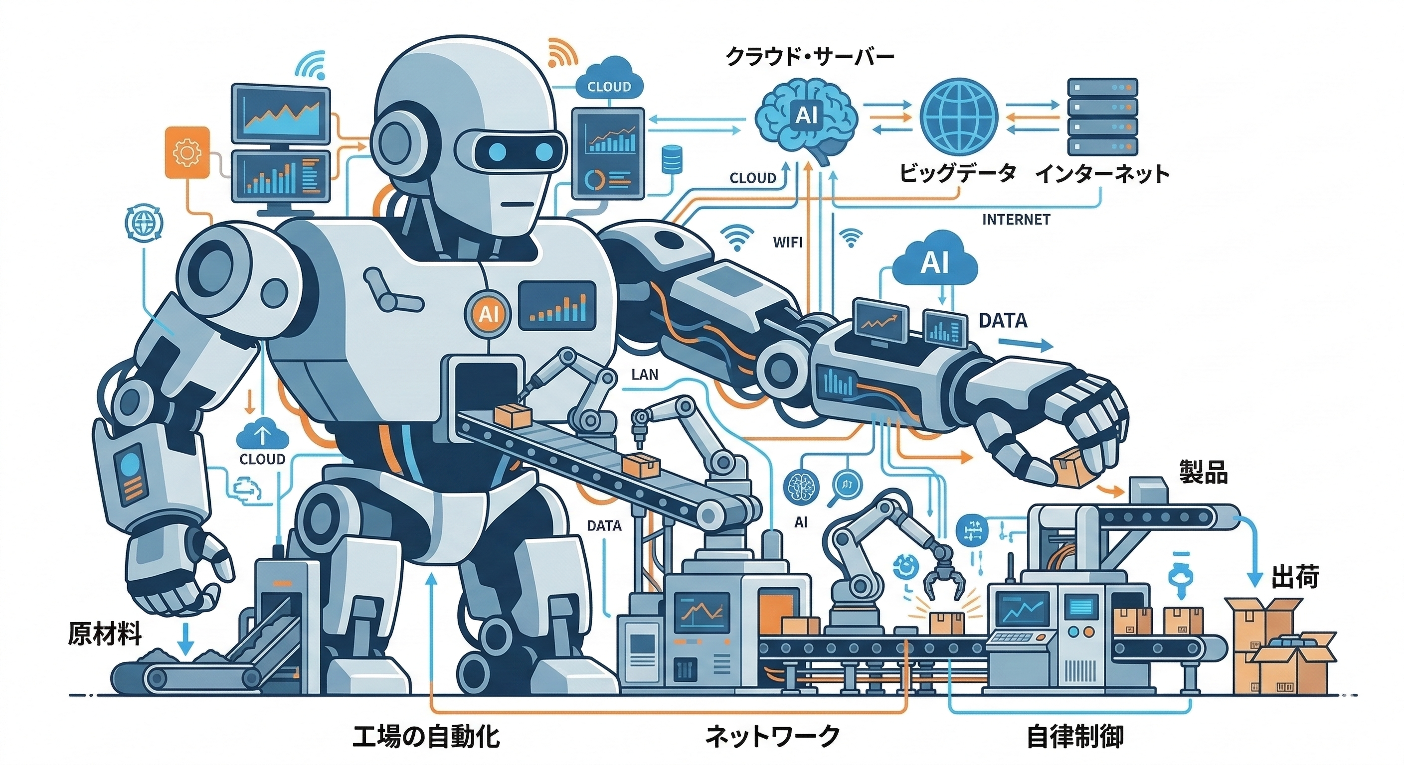 今の工場は、昔と違って機械がインターネットやコンピュータでつながって、自動で動いています。まるで大きなひとつのロボットみたいです。