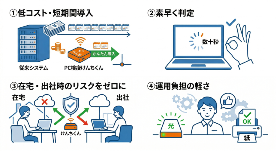 - 素早く判定: 数十秒で社内ネットワークへの接続可否を判定します。