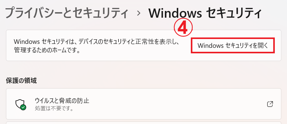 - 「Windows セキュリティを開く」をクリック