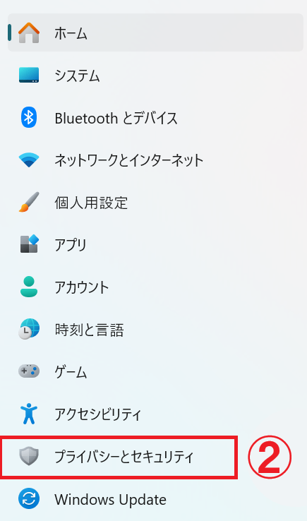 左側のメニューから「プライバシーとセキュリティ」をクリックします。