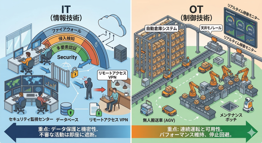 まず、私たちが普段使っている「IT(情報技術)」と、工場の現場にある「OT(制御技術)」の違いを整理しましょう。